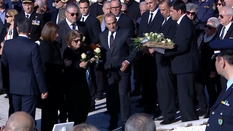 14.40. Η Δάφνη Σημίτη αποχαιρετά με τρία λευκά τριαντάφυλλα τον επί 63 χρόνια σύντροφό της