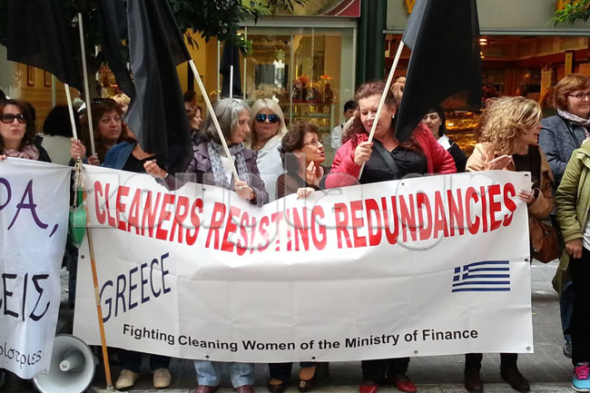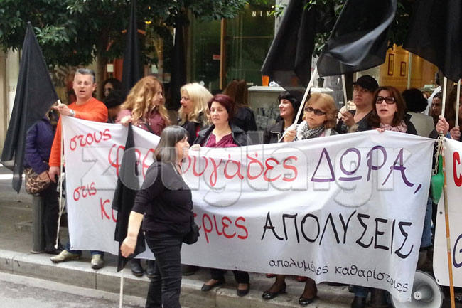 Έξω από το υπουργείο οι καθαρίστριες πραγματοποίησαν διαδήλωση διαμαρτυρίας με κεντρικό σύνθημα: «Πιάστε τους φοροφυγάδες και στις καθαρίστριες αφήστε τους κουβάδες».