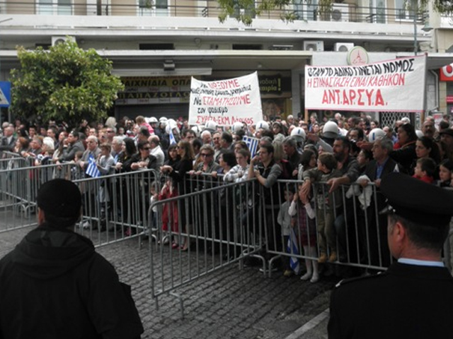 Άλλωστε, η παρουσία της Αστυνομίας ήταν ισχυρή. Στην διασταύρωση της οδού Μ. Αλεξάνδρου και Κύπρου έκανε αισθητή την παρουσία της μια ομάδα της εξωκοινοβουλευτικής αριστεράς και στην διασταύρωση της οδού Κύπρου με την Ερμού, υπήρξε μια ομάδα διαδηλωτών του ΠΑΜΕ.