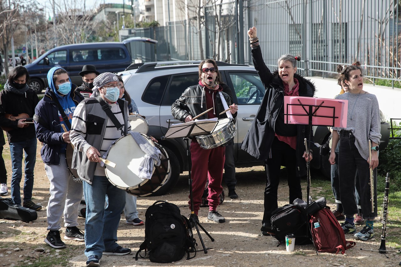 Έξω από το προαύλιο του Μικτού Ορκωτού Δικαστηρίου βρίσκονται καλλιτέχνες οι οποίοι διαμαρτύρονται μετά… μουσικής.