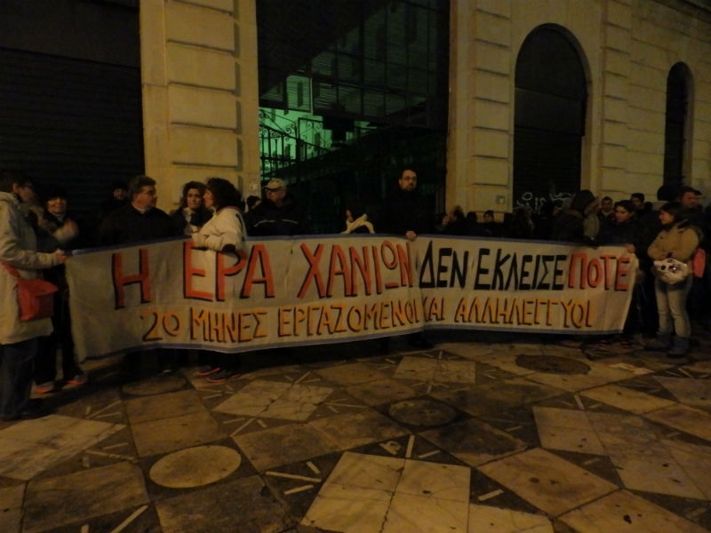 Μέλη και φίλοι του ΣΥΡΙΖΑ και των Ανεξαρτήτων Ελλήνων, της ΑΝΤΑΡΣΥΑ, γιατροί και εργαζόμενοι στο νοσοκομείο της πόλης, εργαζόμενοι της ΕΡΑ Χανίων, αλλά και εκατοντάδες πολίτες όλων των ηλικιών, βγήκαν στον δρόμο, διεκδικώντας ένα καλύτερο μέλλον, χωρίς τις «τοξικές» συνέπειες του μνημονίου.