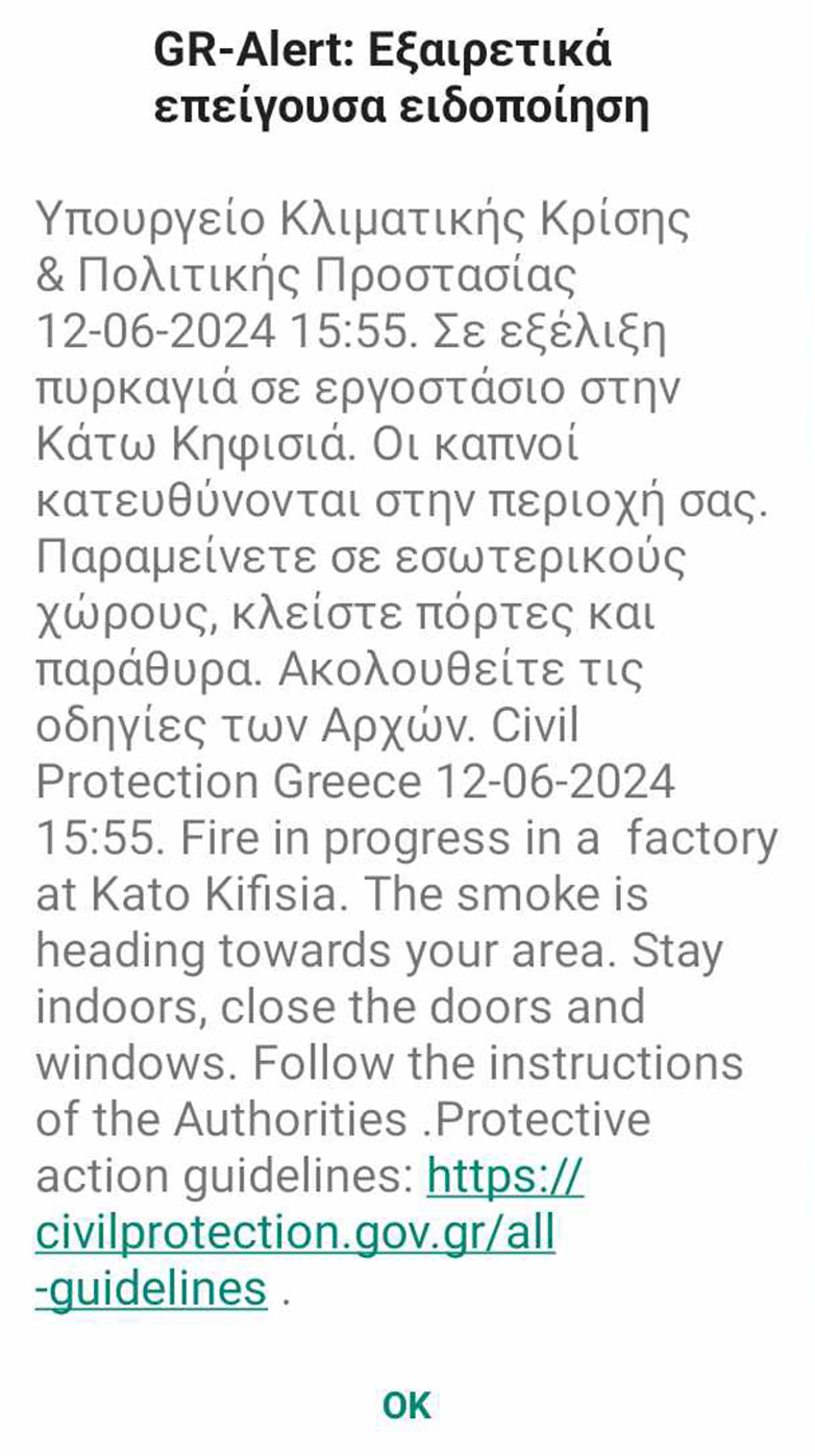 Στις 15:55, μήνυμα μέσω του 112 εστάλη στους πολίτες, καλώντας τους να παραμείνουν σε εσωτερικούς χώρους και να κλείσουν πόρτες και παράθυρα και προειδοποιώντας τους ότι οι καπνοί κατευθύνονται στην περιοχή τους.