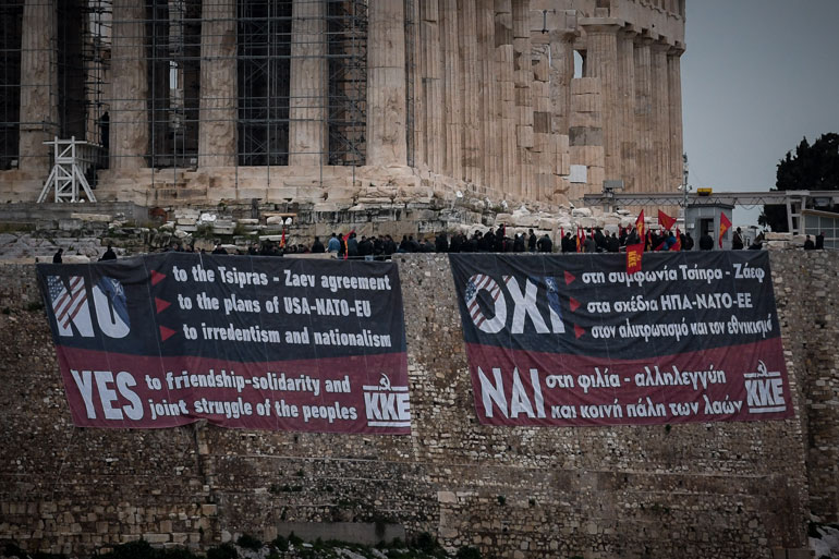 Πανό κατά της Συμφωνίας των Πρεσπών ανήρτησαν μέλη του ΚΚΕ στην Ακρόπολη. Στα δύο πανό αναγράφεται το σύνθημα...