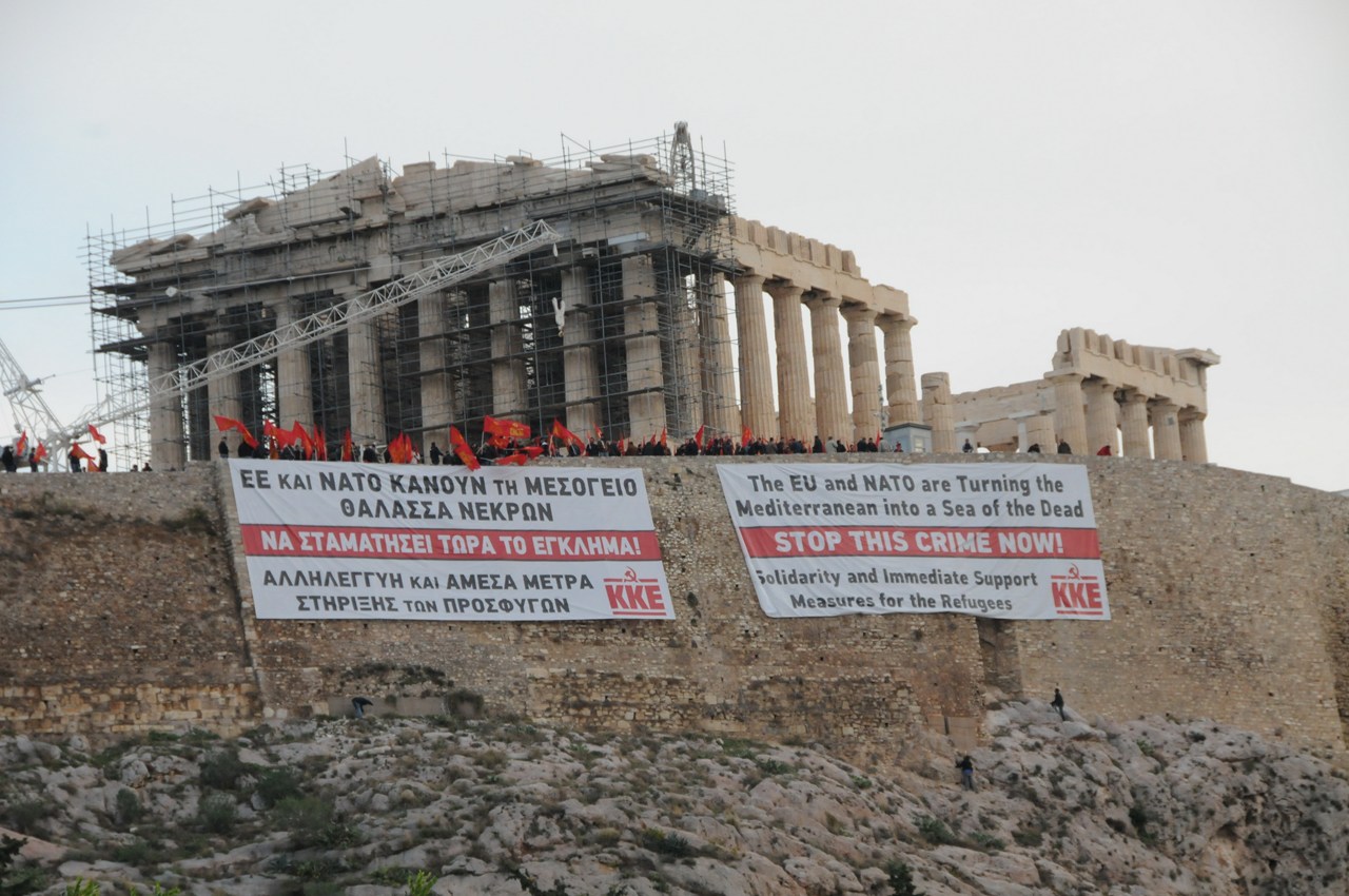 Δύο μεγάλα πανό σήκωσαν σήμερα το πρωί στην Ακρόπολη, μέλη του ΚΚΕ και της ΚΝΕ, σε ένδειξη αλληλεγγύης στους πρόσφυγες.