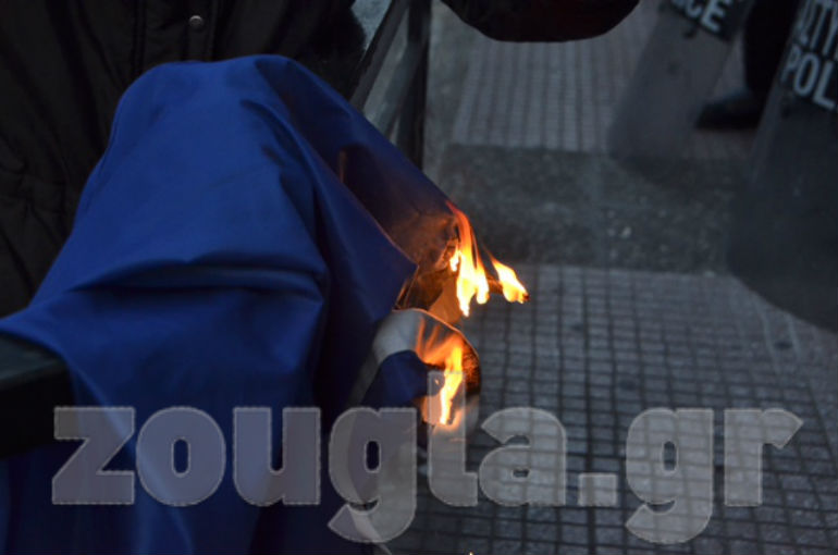 τονίζοντας ότι «κανένας δεν πρέπει να μείνει απαθής απέναντι στο συνεχιζόμενο έγκλημα, τους μαζικούς πνιγμούς μεταναστών και προσφύγων στη Μεσόγειο».Μάλιστα, φτάνοντας έξω από το κτήριο της Ευρωπαϊκής Ένωσης κατέβασαν τη σημαία που κυμάτιζε και της έβαλαν φωτιά, ενώ πέταξαν κόκκινη μπογιά στην είσοδο.