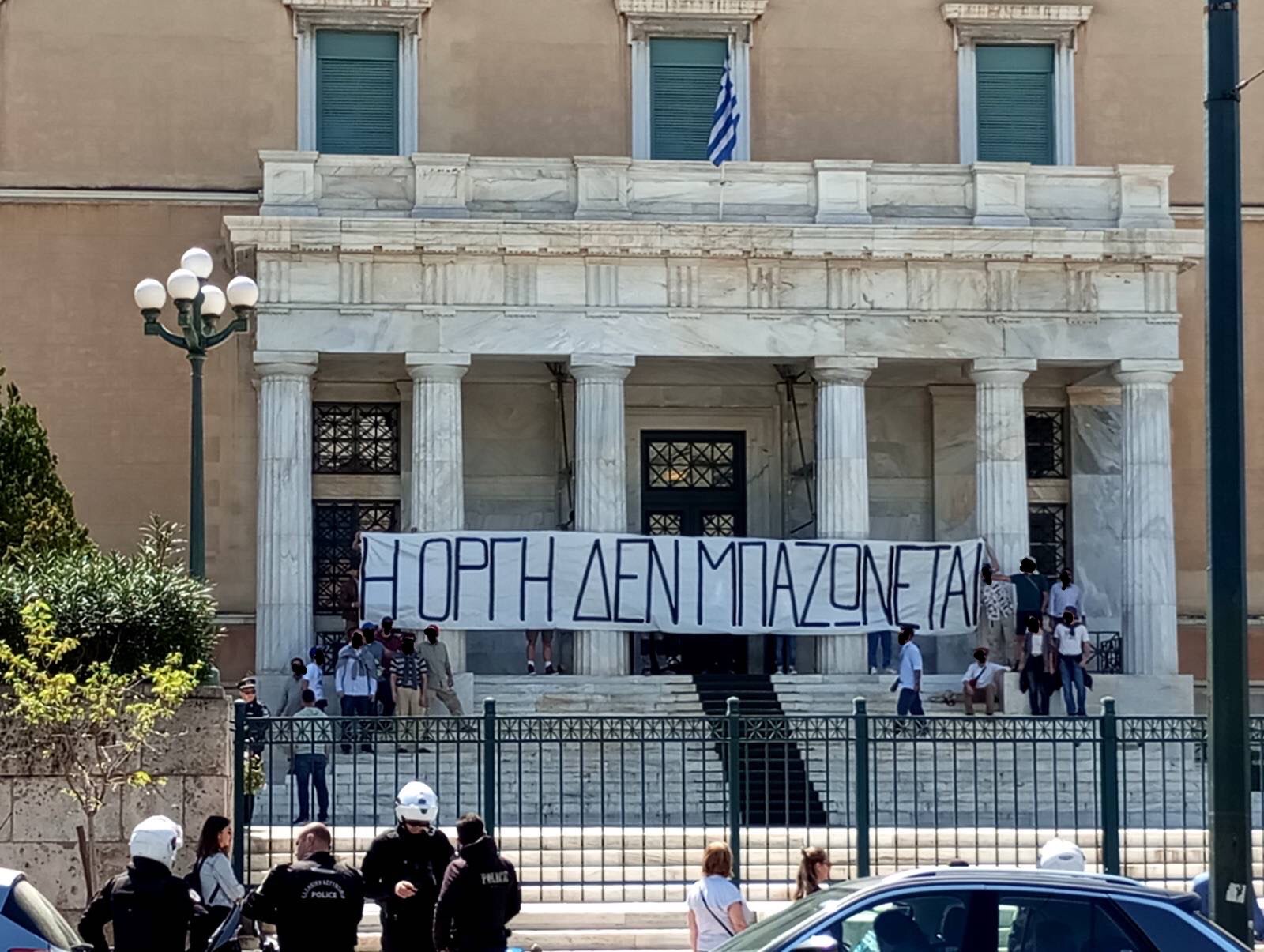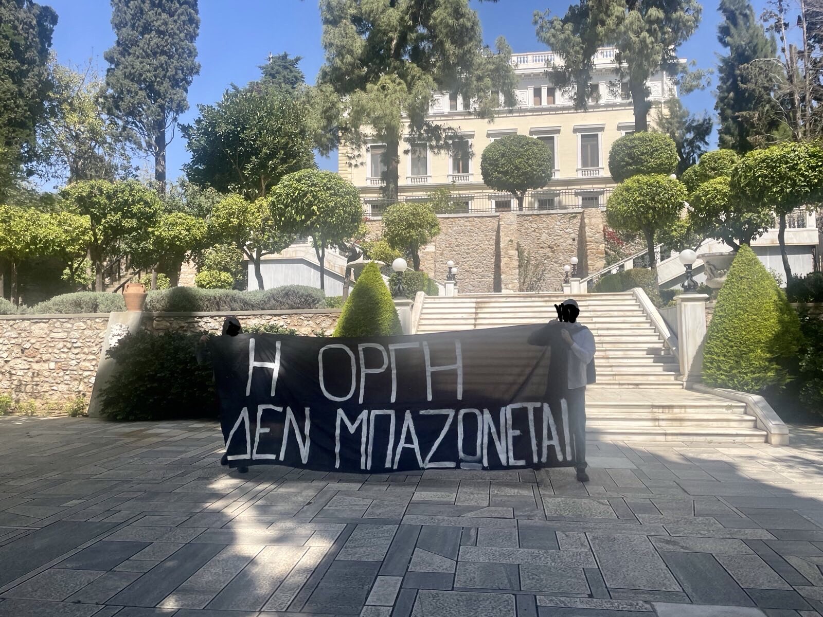 Ταυτόχρονη παρέμβαση για τα Τέμπη μπροστά στην Βουλή και το Μέγαρο Μαξίμου πραγματοποίησαν μέλη του Ρουβίκωνα. Συγκεκριμένα, σήκωσαν πανό στο οποίο έγραφαν: «Η οργή δεν μπαζώνεται». Σύμφωνα με πληροφορίες, 15 άτομα μπήκαν στον χώρο της Βουλής και επιπλέον 7 στο Μέγαρο Μαξίμου.