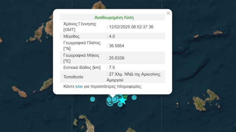 Στις 10.52 της Τετάρτης έγινε δόνηση 4,0 Ρίχτερ, με επίκεντρο 27 χλμ. ΝΝΔ της Αρκεσίνης Αμοργού και εστιακό βάθος 7,5 χιλιόμετρα.