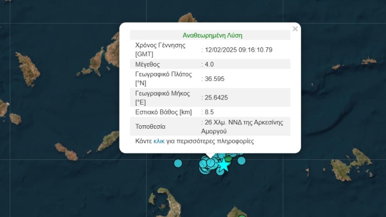 Στις 11:16 της Τετάρτης έγινε σεισμός 4,0 Ρίχτερ, με επίκεντρο 26 χλμ. ΝΝΔ της Αρκεσίνης Αμοργού και εστιακό βάθος στα 8,5 χιλιόμετρα.