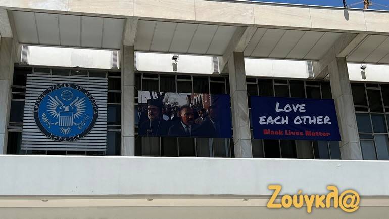 Την ίδια ώρα, στην πρόσοψη του κτηρίου επί της λεωφόρου Βασιλίσσης Σοφίας έχουν αναρτηθεί δύο πανό, στα οποία αναγράφεται η φράση “Love each other – Black Lives Matter”.