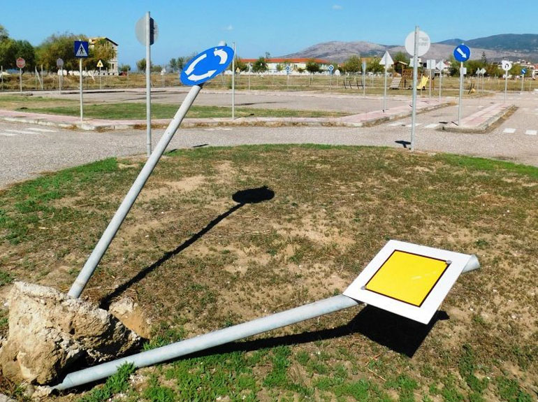 Ειδικότερα, όπως αναφέρει ο κ. Σκαρμούτσος, «άγνωστοι, που φαίνεται να εισέβαλαν στον χώρο τις νυχτερινές ώρες, κατέστρεψαν ολοσχερώς μεγάλο αριθμό οδικών σημάτων, καθίσματα, καθώς και μέρος της περίφραξης». Επίσης, προσθέτει ότι «δεν φαίνεται να έχει κλαπεί εξοπλισμός, γι’ αυτό εκτιμάται ότι το μοναδικό κίνητρο των αγνώστων ήταν ο βανδαλισμός».