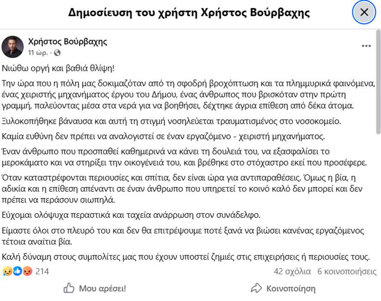 «Την ώρα που η πόλη μας δοκιμάζεται από τις πλημμύρες, ένας χειριστής μηχανήματος έργου του Δήμου — ένας άνθρωπος που εργάζεται για να στηρίξει την κοινότητα και την οικογένειά του — δέχτηκε άγρια επίθεση από δέκα άτομα. Ξυλοκοπήθηκε βάναυσα και αυτή τη στιγμή νοσηλεύεται τραυματισμένος».