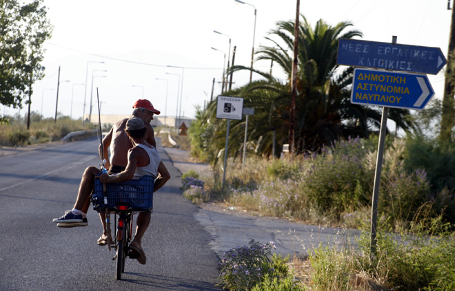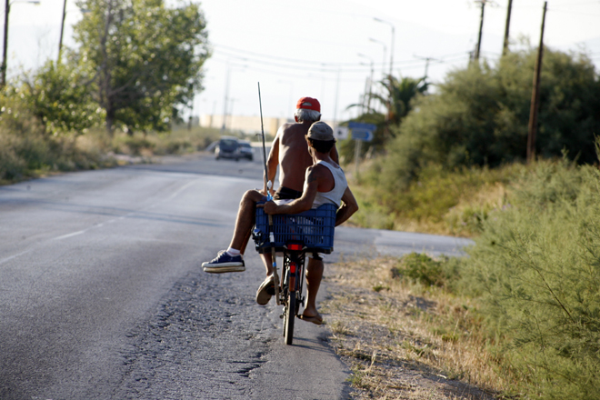 Δύο άνδρες στην παραλιακή Ναυπλίου – Ν. Κίου κατά την επιστροφή τους από το ψάρεμα συνέλαβε ο φωτογραφικός φακός. Στα στιγμιότυπα διακρίνονται οι δύο άνδρες να επιστρέφουν σπίτι τους με το ποδήλατο, μεταφέροντας τα σύνεργά τους.