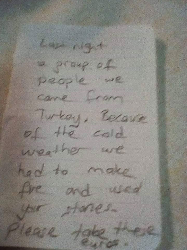 Η ομάδα των μεταναστών έφτασε μέχρι το καφενείου του χωριού και πήρε από τα δύο τσουβάλια που υπήρχαν έξω από το κλειστό καφενείο ξύλα τα οποία τα έκαψε σε παρακείμενο σημείο. Πριν αποχωρήσουν άφησαν 10 ευρώ. Οι ίδιοι περιγράφουν τι συνέβη στο σημείωμα που άφησαν στην πόρτα του καφενείου.
