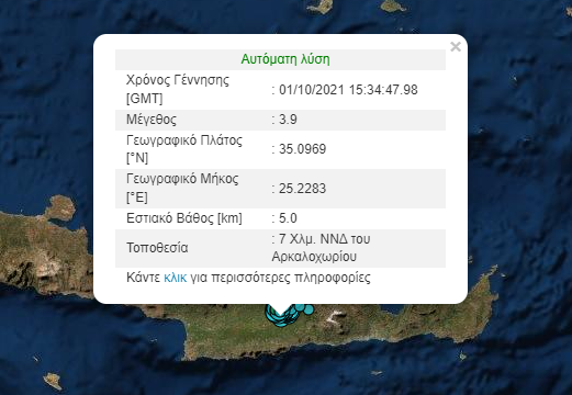 Μετασεισμός μεγέθους 3,9 Ρίχτερ σημειώθηκε στις 18:34 τη Παρασκευή στο Αρκαλοχώρι Ηρακλείου...