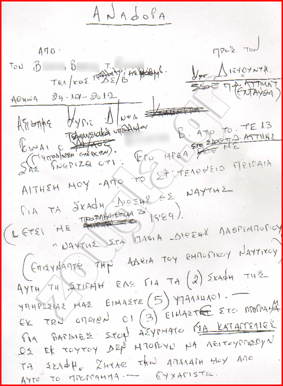 «Είμαι ο τελωνειακός υπάλληλος Β. Β. από την υποδιεύθυνση ελέγχων. Σας γνωρίζω ότι εγώ ήρθα στο ΣΔΟΕ Π. Δ. Αττικής με αίτηση μου από το ΣΤ’ Τελωνείο Πειραιά για τα σκάφη δίωξης ως ναύτης (και έτσι προσλήφθηκα το 1989 – ‘Ναύτης στα πλοία δίωξης λαθρεμπορίου’)» αναφέρει ο υπάλληλος ξεκινώντας την αναφορά του.