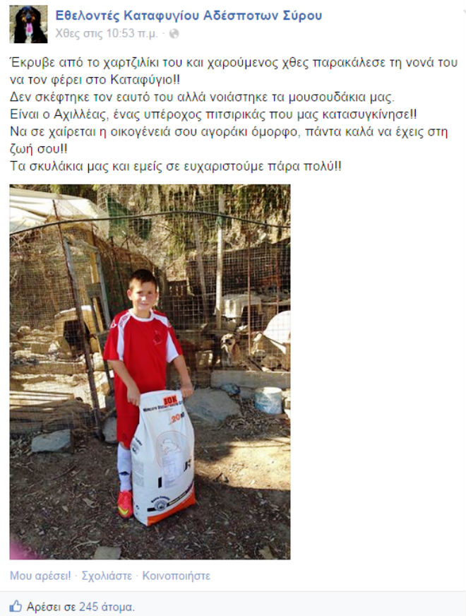«Έκρυβε από το χαρτζιλίκι του και χαρούμενος χθες παρακάλεσε τη νονά του να τον φέρει στο Καταφύγιο! Δεν σκέφτηκε τον εαυτό του αλλά νοιάστηκε τα μουσουδάκια μας. Είναι ο Αχιλλέας, ένας υπέροχος πιτσιρικάς που μας κατασυγκίνησε! Να σε χαίρεται η οικογένειά σου αγοράκι όμορφο, πάντα καλά να έχεις στη ζωή σου! Τα σκυλάκια μας και εμείς σε ευχαριστούμε πάρα πολύ!»