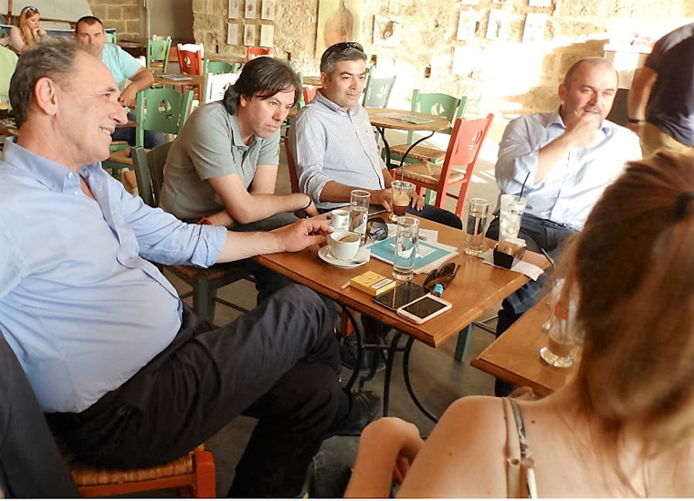 Συνοδευόμενος από Χανιώτες φίλους και συνεργάτες, τον Γιάννη Χίνο, τον διευθύνοντα σύμβουλο του ΟΑΚ, Φώτη Καζάση, τον υπεύθυνο του γραφείου του στο υπουργείο, Ναπολέοντα Ξιφαρά καθώς και τον γενικό γραμματέα Ηλία Ξανθάκο, απόλαυσε έναν απογευματινό καφέ στο Νεώριο Μόρο, πριν από την έναρξη μιας δύσκολης εβδομάδας που ξεκινάει με υποχρεώσεις στη Θεσσαλονίκη και με ένα σύντομο ταξίδι στην Αμερική (σ.σ. στο τέλος της εβδομάδας).