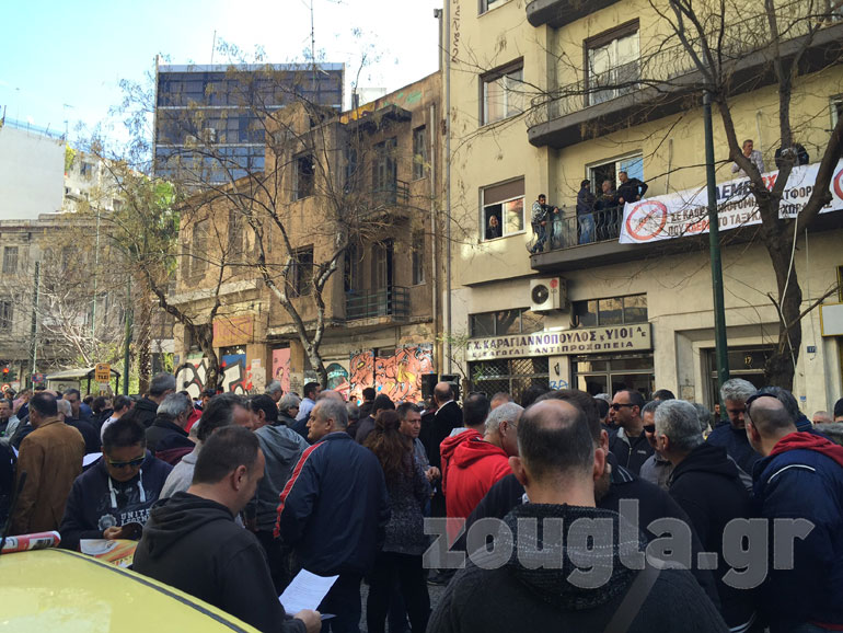 Οι συγκεντρωμένοι αντιδρούν στην «παράνομη και αυθαίρετη εισβολή της Uber στις επιβατικές μεταφορές».