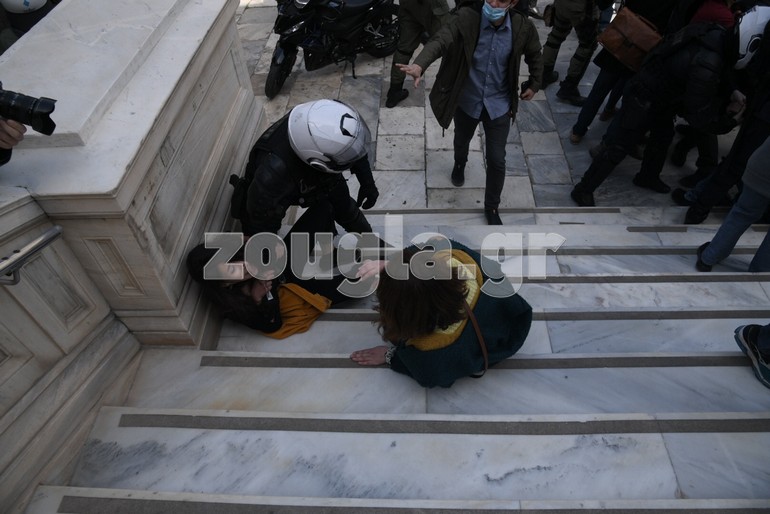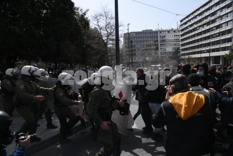 Νωρίτερα, οι διαδηλωτές συγκεντρώθηκαν στο Σύνταγμα όπου οι αστυνομικές δυνάμεις τους απώθησαν προς την Ερμού, ενώ στη συνέχεια κινήθηκαν προς την οδό Κολοκοτρώνη.
