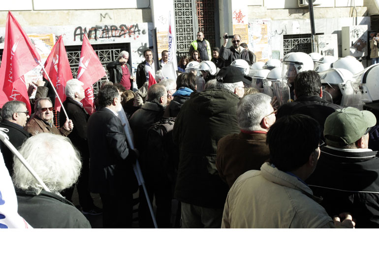 Μπροστά από το Ναυτικό Απομαχικό Ταμείο συγκεντρώθηκαν νωρίς πρωί του Σαββάτου μέλη της Λαϊκής Ενότητας, ενώ ακριβώς απέναντι στην εκκλησία της Αγίας Τριάδας τελούνταν η Θεία λειτουργία για τον εορτασμό των Θεοφανίων.