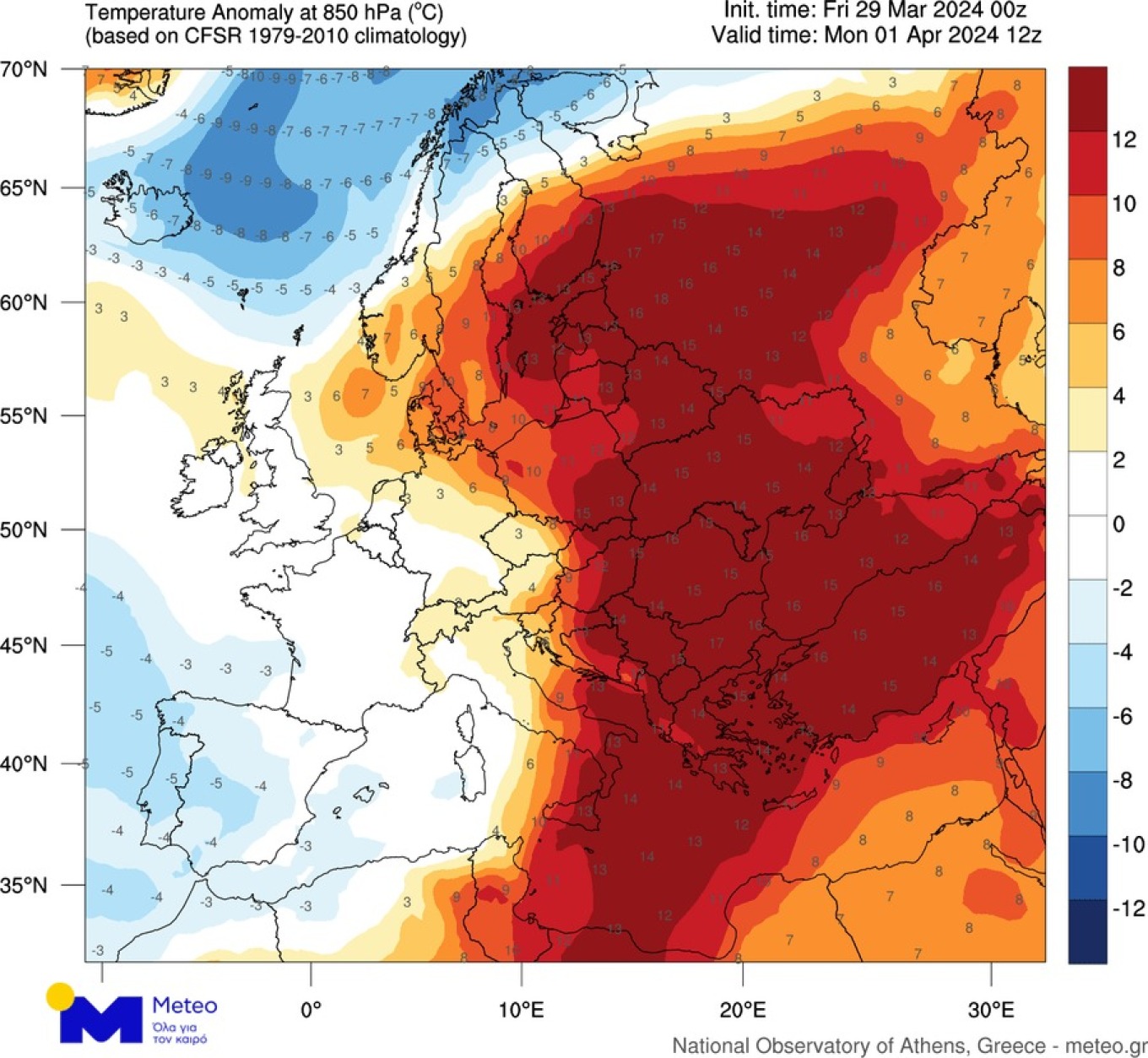 Χρησιμοποιώντας την απόκλιση της θερμοκρασίας στο ισοβαρικό επίπεδο των 850 hPa (περίπου 1500 μέτρα πάνω από την επιφάνεια της θάλασσας), επίπεδο που χρησιμοποιούμε για την παρακολούθηση τον αερίων μαζών, οι αέριες μάζες πάνω από τμήματα της Ανατολικής Ευρώπης αναμένεται να είναι έως και 17-18 βαθμούς Κελσίου υψηλότερες από τα κανονικά για την εποχή επίπεδα.