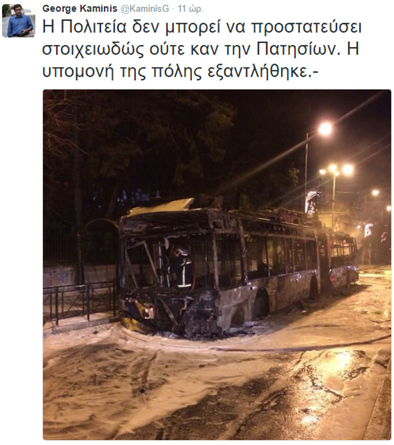 «Η Πολιτεία δεν μπορεί πια να προστατεύσει στοιχειωδώς ούτε μια κεντρική αρτηρία, όπως είναι η Πατησίων. Η υπομονή της πόλης εξαντλήθηκε» έγραψε ο κ. Καμίνης ανεβάζοντας φωτογραφία με τα τρόλεϊ που κάηκαν: