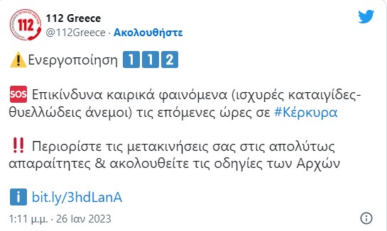 Στους κατοίκους Μαγνησίας των Σποράδων και της Κέρκυρας ήχησε το μήνυμα του 112 λόγω των επικίνδυνων καιρικών φαινομένων.