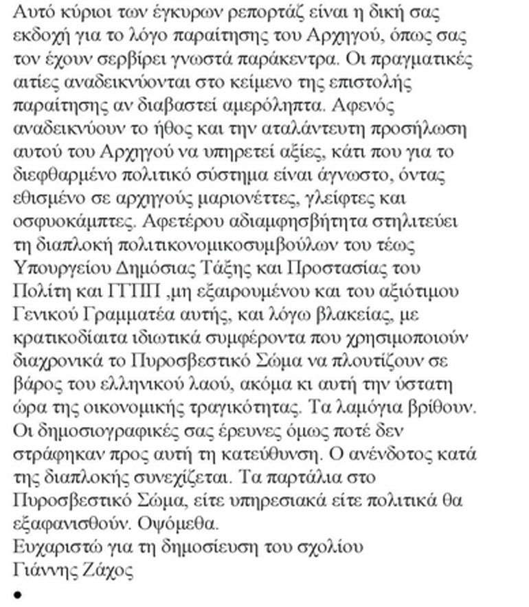 «Μετά και τη σημερινή επώνυμη συκοφαντική, αναληθή, εξυβριστική και περιέχουσα προσβολές κατά της προσωπικότητάς μου ανάρτηση του αξιωματικού του Πυροσβεστικού Σώματος Γιάννη Ζάχου, σε ηλεκτρονικά μέσα κοινωνικής δικτύωσης, είμαι υποχρεωμένος να καταφύγω στην ελληνική δικαιοσύνη εναντίον του για την προστασία της τιμής και της υπόληψής μου, αλλά και για την αποκατάσταση και ανάδειξη της αλήθειας».