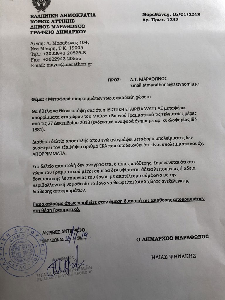 Σήμερα ο δήμαρχος Μαραθώνα με έγγραφο του ζητεί από την Ελληνική Αστυνομία να προβεί στην «άμεση διακοπή της απόθεσης απορριμμάτων στη θέση Γραμματικό» καθώς όπως αναφέρει: