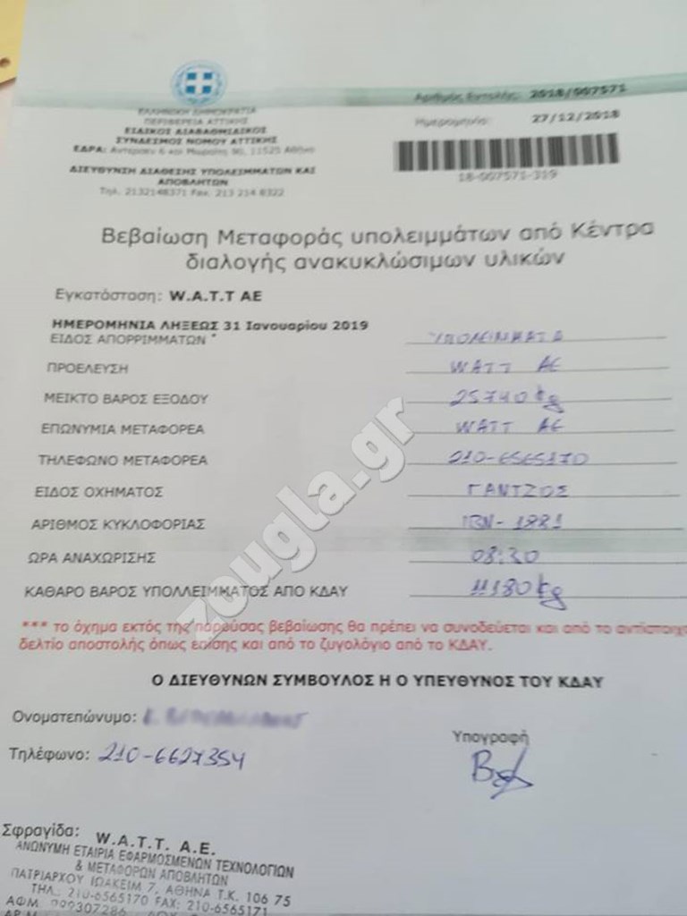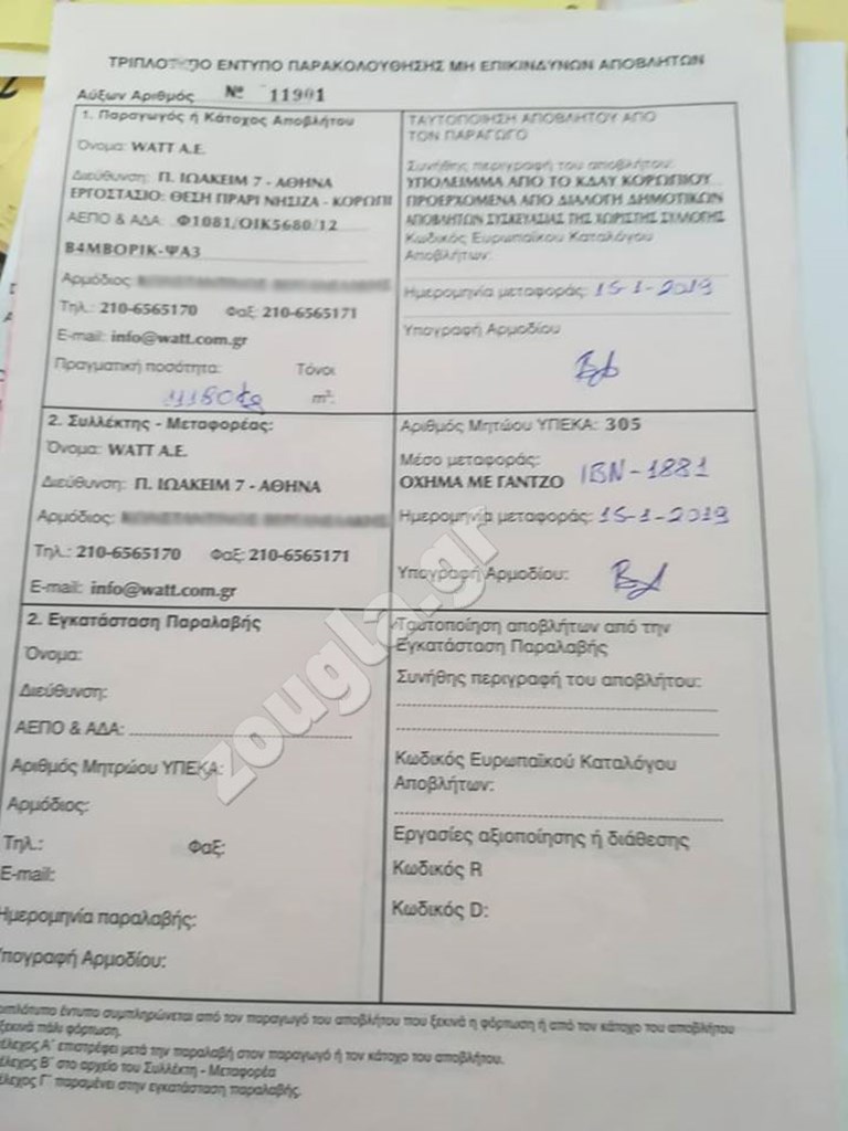 Το zougla.gr δημοσιεύει το επίμαχα έγγραφα που φέρει το απορριμματοφόρο, ενώ λείπουν οι άδειες, τα νόμιμα παραστατικά αλλά και ο απαραίτητος 6ψηφιος κωδικός για τη μεταφορά υπολειμμάτων: