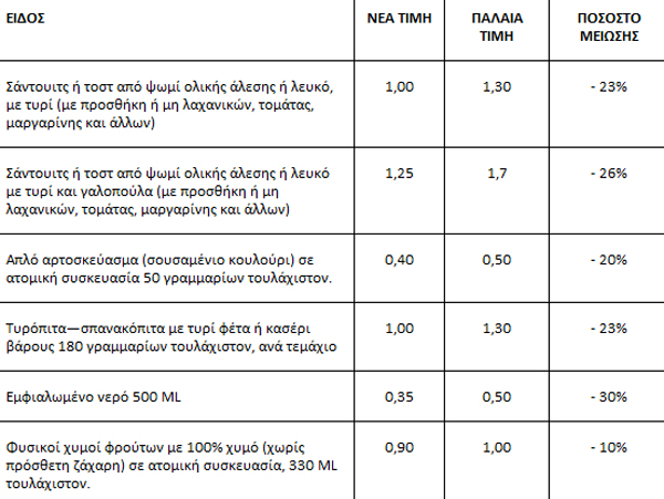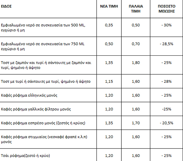 Με αγορανομική διάταξη, το υπουργείο Ανάπτυξης, Ανταγωνιστικότητας, Υποδομών, Μεταγορών και Δικτύων επιβάλλει τη μείωση των ανώτατων τιμών κατά τουλάχιστον 20% σε είδη όπως ο καφές, το εμφιαλωμένο νερό, το τοστ και η τυρόπιτα, σε κυλικεία σχολείων και χώρους εστίασης.