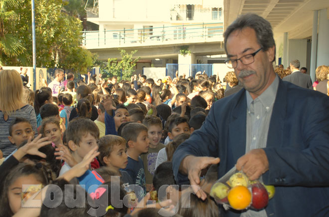 «Τα φρούτα είναι η σωστή διατροφή για τα παιδιά κι όχι τα γαριδάκια» είπε χαρακτηριστικά ο κ. Γιακουμάτος για να καταχειροκροτηθεί από δασκάλους και παιδιά.