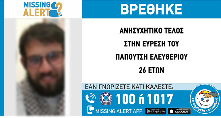 Εντοπίστηκε ο 26χρονος Ελευθέριος Παπουτσής, ο οποίος είχε εξαφανιστεί από την Κυψέλη την Τρίτη (24/05) και το «Χαμόγελο του Παιδιού» είχε ενεργοποιήσει συναγερμό Missing Alert.