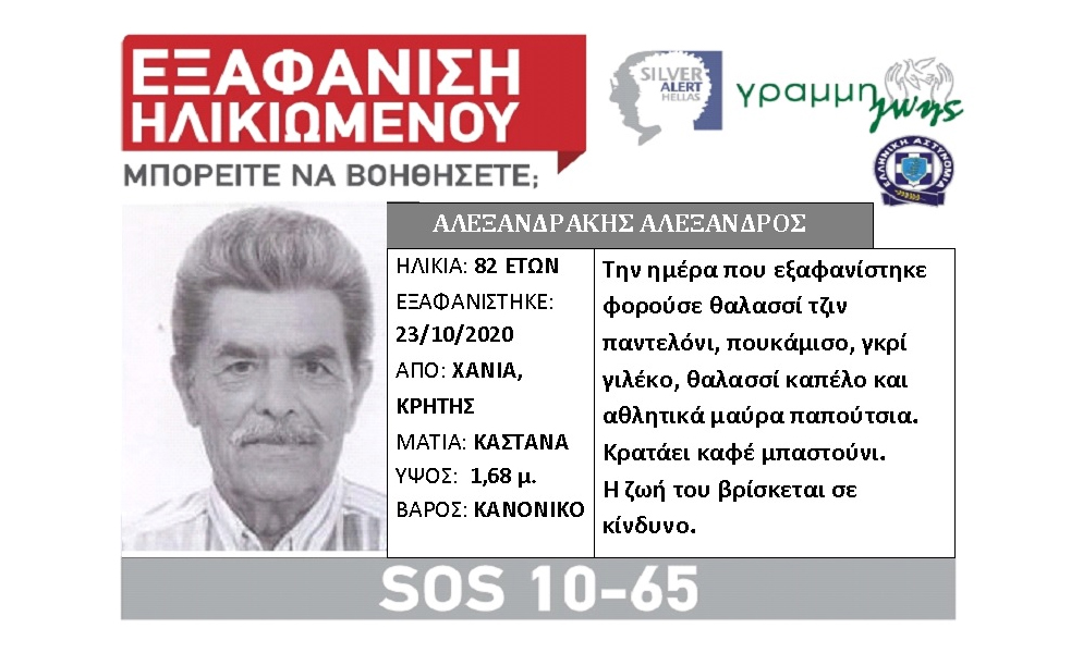 Σύμφωνα με την ανακοίνωση, ο 82χρονος Αλέξανδρος Αλεξανδράκης εξαφανίστηκε την περασμένη Παρασκευή από την περιοχή των Χανίων και η ζωή του βρίσκεται σε κίνδυνο.