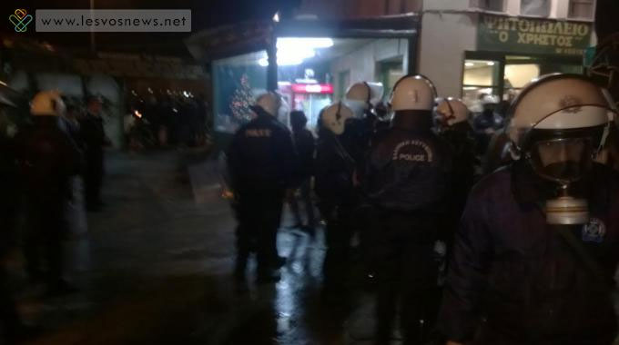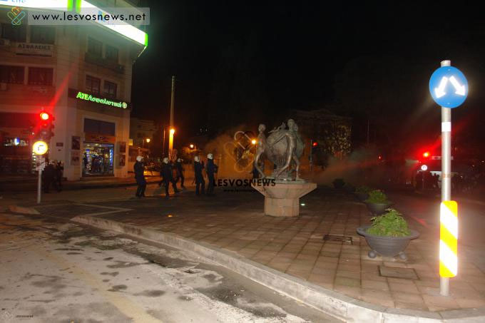 Αστυνομικές δυνάμεις παρακολουθούσαν την ειρηνική πορεία καθ’ όλη τη διάρκεια, ενώ σε όλους τους δρόμους υπήρχε μεγάλος αριθμός αστυνομικών με πολιτικά. Τη στιγμή που η πορεία έφτασε στην πλατεία Κυπρίων Πατριωτών δύο άτομα έριξαν πέτρες προς τους αστυνομικούς. Οι πέτρες μάλλον ήταν το σύνθημα που περίμενε η αστυνομία για να διαλύσει την πορεία…. Αμέσως άρχισε να πέφτει βροχή από κροτίδες κρότου λάμψης. «Αδιακρίτως οι αστυνομικοί έριχναν κρότου λάμψης μέσα στο ψαχνό της πορείας. Μία έπεσε πάνω στο πόδι εργαζόμενης. Δεν έχει ξανασυμβεί αυτό στη Μυτιλήνη!», σύμφωνα με μαρτυρίες διαδηλωτών. Ακολούθησε πανικός, με το μεγαλύτερο μέρος των διαδηλωτών να κατευθύνεται προς την προκυμαία και στην είσοδο του Δημοτικού Θεάτρου.