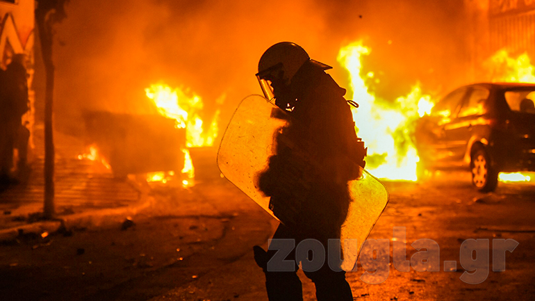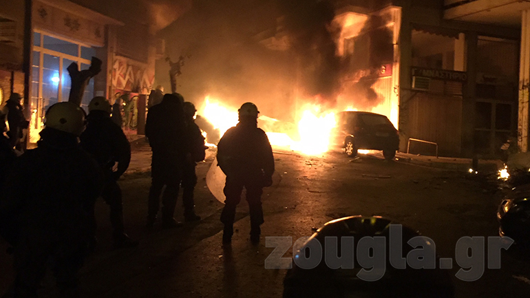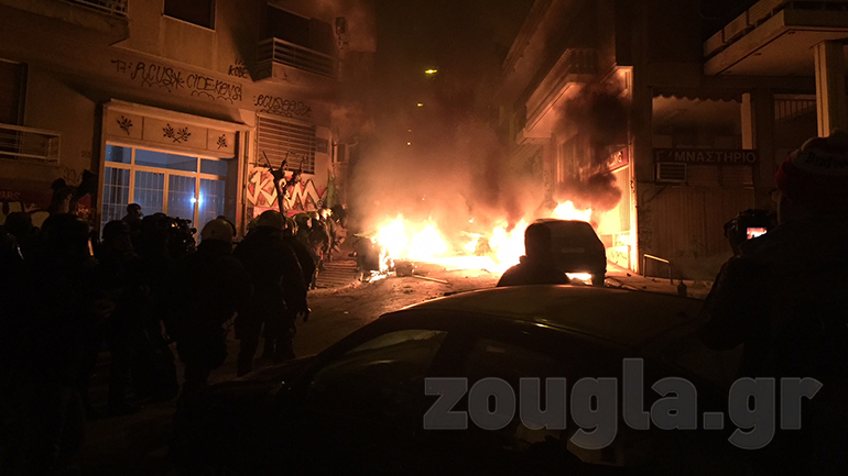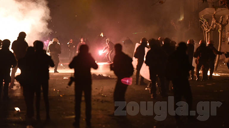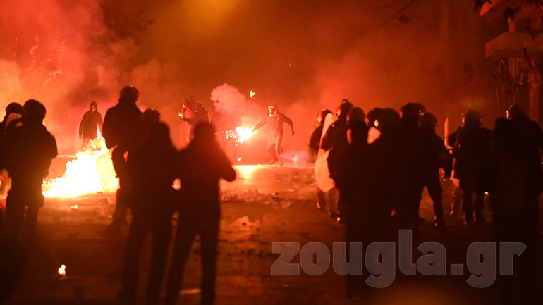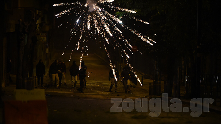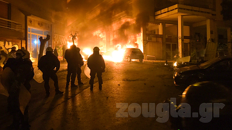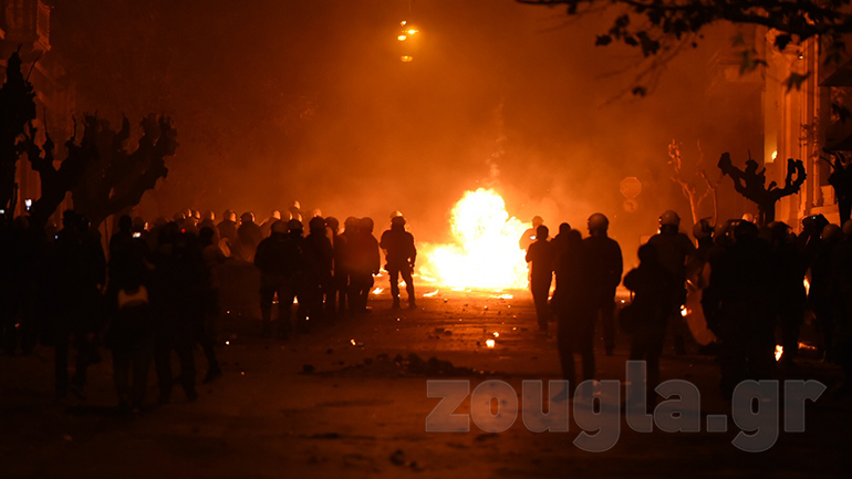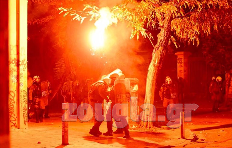 Δεκάδες νεαρά άτομα άρχισαν τον πετροπόλεμο στην αρχή και όταν κινήθηκαν τα ΜΑΤ άρχισε η βροχή των μολότοφ. Κάποια στιγμή οι αστυνομικές δυνάμεις ζήτησαν από τα τηλεοπτικά συνεργεία και τους δημοσιογράφους να απομακρυνθούν προς την οδό Πατησίων ώστε να μπορούν να ελιχθούν οι άνδρες των ΜΑΤ αλλά και για να μην υπάρξει κίνδυνος τραυματισμού.