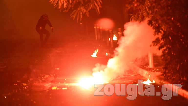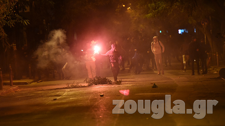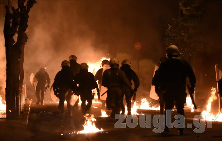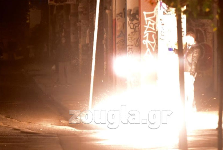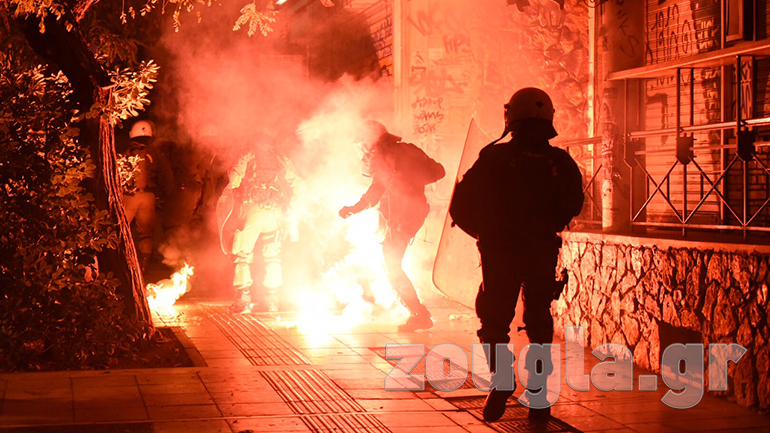 Δεκάδες νεαρά άτομα άρχισαν τον πετροπόλεμο στην αρχή και όταν κινήθηκαν τα ΜΑΤ άρχισε η βροχή των μολότοφ. Κάποια στιγμή οι αστυνομικές δυνάμεις ζήτησαν από τα τηλεοπτικά συνεργεία και τους δημοσιογράφους να απομακρυνθούν προς την οδό Πατησίων ώστε να μπορούν να ελιχθούν οι άνδρες των ΜΑΤ αλλά και για να μην υπάρξει κίνδυνος τραυματισμού.
