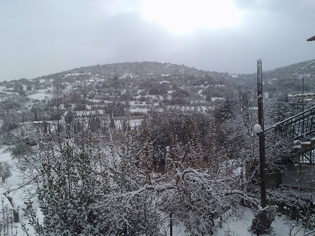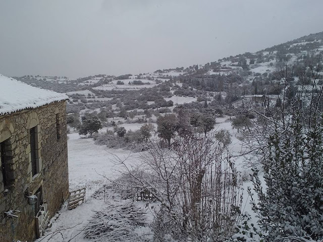 Το χιόνι «στόλισε» με μοναδικό τρόπο την Καρυά στην Αργολίδα, καλύπτοντας στέγες και αυλές σπιτιών, καθώς και τα γραφικά σοκάκια του οικισμού.