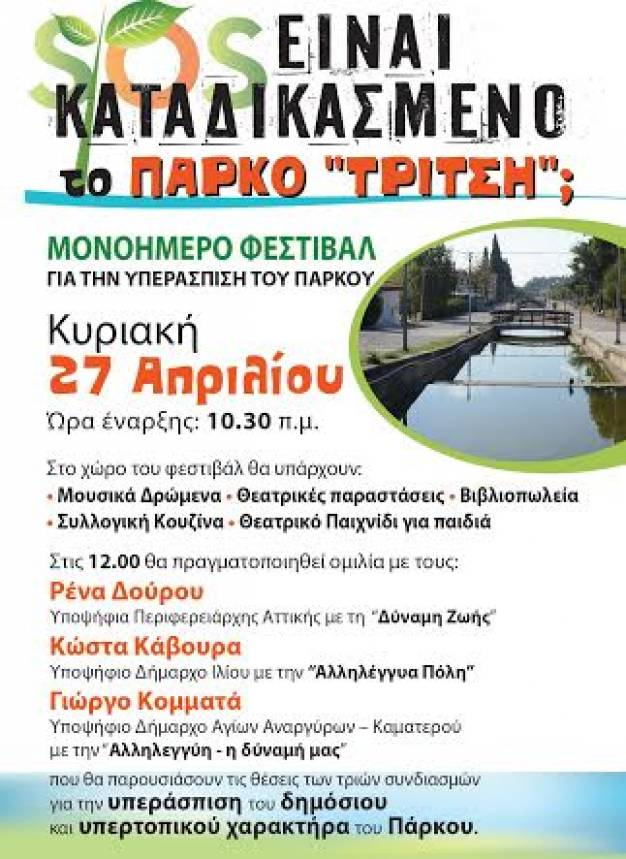Οι δημοτικές κινήσεις, «Αλληλέγγυα Πόλη» από το Ίλιον, «Αλληλεγγύη – η δύναμή μας» από τους Αγίους Αναργύρους – Καματερό και η περιφερειακή παράταξη «Δύναμη Ζωής», σας καλούν στο πολιτιστικό φεστιβάλ που διοργανώνουν την Κυριακή 27/4/2014, με ώρα έναρξης 10.30 το πρωί, στο Πάρκο Αντώνης Τρίτσης.