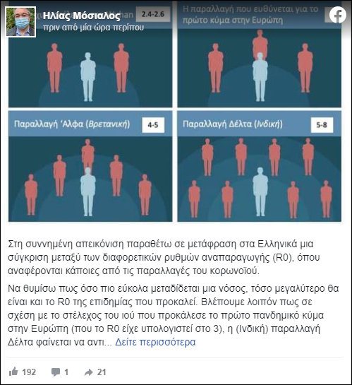 Χρειάζεται προσοχή ώστε να μην επικρατήσει η ινδική παραλλαγή Δέλτα του κορωνοϊού, γιατί εάν αυτό συμβεί, η διασπορά στους μη εμβολιασμένους θα είναι μεγαλύτερη σε σύγκριση με αυτή της βρετανικής παραλλαγής. Τη σχετική προειδοποίηση κάνει ο καθηγητής Πολιτικής της Υγείας, Ηλίας Μόσιαλος της Σχολής Οικονομικών και Πολιτικών Επιστημών του Λονδίνου (LSE) σε ανάρτησή του στο Facebook.