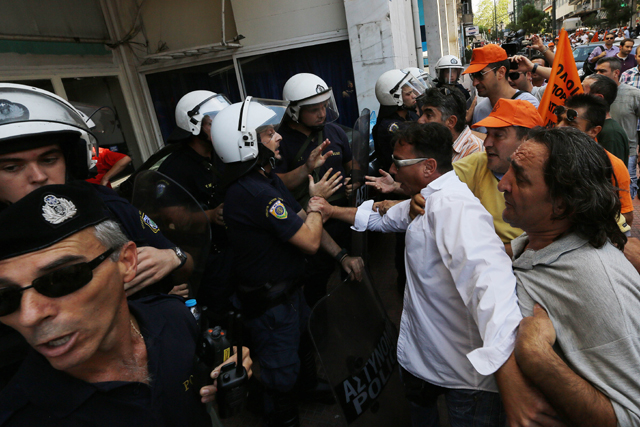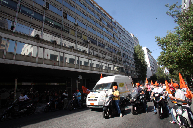 «Κουβέλη ντροπή, μας κλέβεις το ψωμί» ήταν το σύνθημα που κυριάρχησε, όταν η πορεία των διαδηλωτών της ΠΟΕ-ΟΤΑ πέρασε έξω από τα γραφεία της Δημοκρατικής Αριστεράς.
