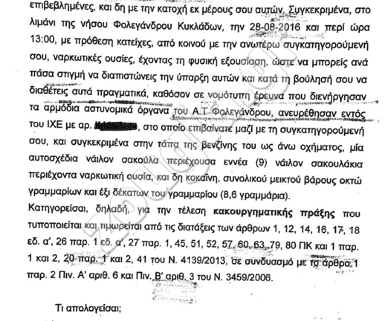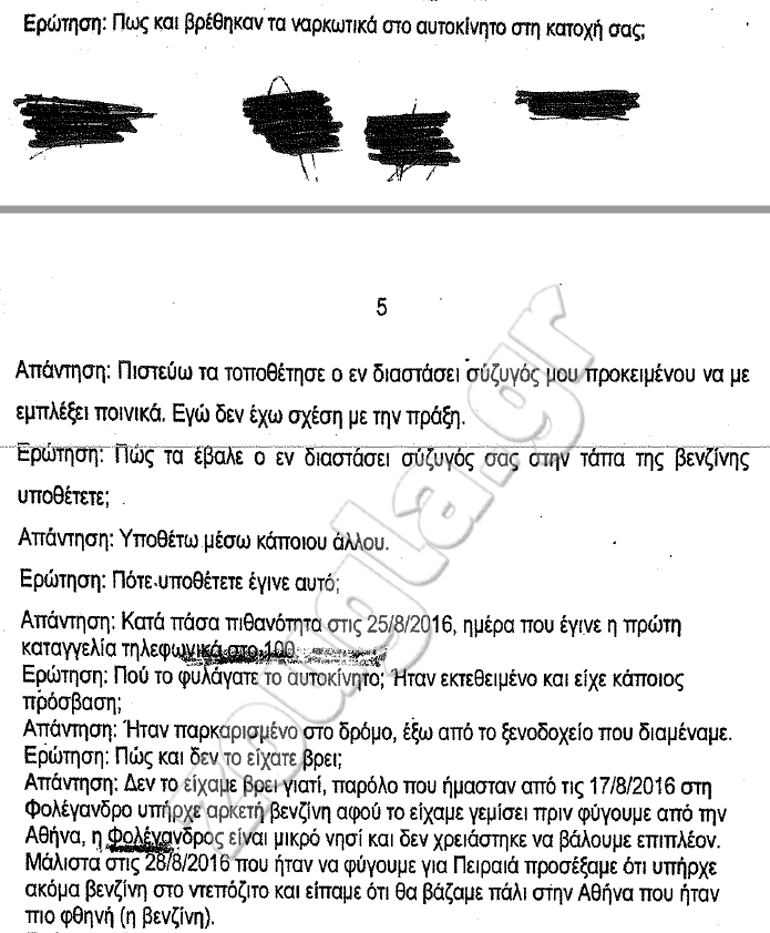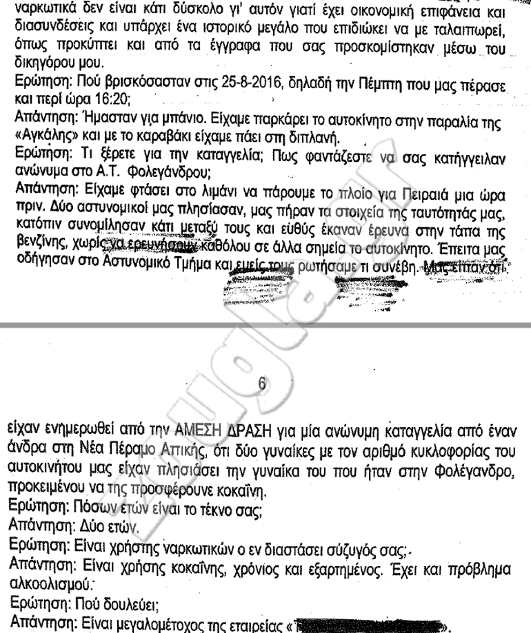 »Όπως οι ίδιοι οι αστυνομικοί του σταθμού της Φολεγάνδρου μας εδήλωσαν , η πλήρης καταγγελία είχε ως εξής: Ένας κύριος, ο οποίος διαμένει κατά τα λεγόμενά του στη Νέα Πέραμο, δήλωσε στην άμεσο δράση ότι, η σύζυγός του, η οποία παραθέριζε στο εν λόγω νησί, προσεγγίστηκε, την 25η.08.2016 από δύο γυναίκες που επέβαιναν στο ανωτέρω αναφερόμενο όχημα, οι οποίες τις πούλησαν ναρκωτικές ουσίες. Στη συνέχεια την επόμενη ημέρα τηλεφώνησε και πάλι στην άμεσο δράση και ανέφερε για άλλη μία φορά το περιστατικό δηλώνοντας επιπροσθέτως ότι τα ναρκωτικά κρύβονται στην τάπα της βενζίνης.