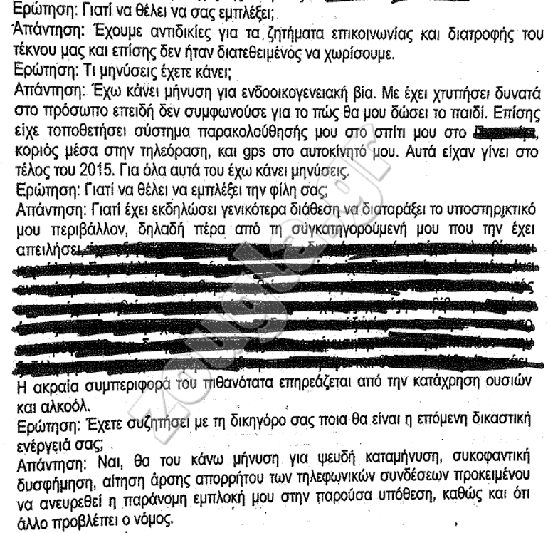 «Όταν ο εν διαστάσει σύζυγός μου βρισκόταν υπό την επήρεια ναρκωτικών ουσιών και αλκοόλ γινόταν ιδιαίτερα βίαιος και είχαν λάβει χώρα διάφορα περιστατικά στα οποία είχα σπάσει τα έπιπλα του σπιτιού, με είχε κλειδώσει μέσα στο σπίτι και δεν με άφηνε να βγω, είχε διαλύσει με πέτρες ένα αυτοκίνητο κ.ά. Μάλιστα, την τελευταία ημέρα της κοινής μας ζωής με είχε απειλήσει με τις φράσεις «Θα σε σκοτώσω και θα σε βάλω στον ασβέστη. Σε μια εβδομάδα δεν θα υπάρχει ίχνος από το DNA σου».