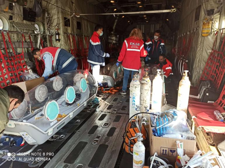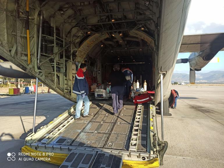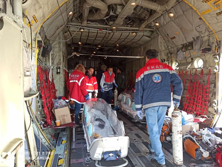 »Σήμερα το πρωί στις 10:00 απογειώθηκε πτητική ομάδα του τμήματος Αεροδιακομιδών ΕΚΑΒ αποτελούμενη από τρεις ιατρούς και τρεις διασώστες με C-130 προκειμένου να διακομίσουν τρία διασωληνωμένα περιστατικά Covid-19 από το αεροδρόμιο της Καβάλας στην Αθήνα».