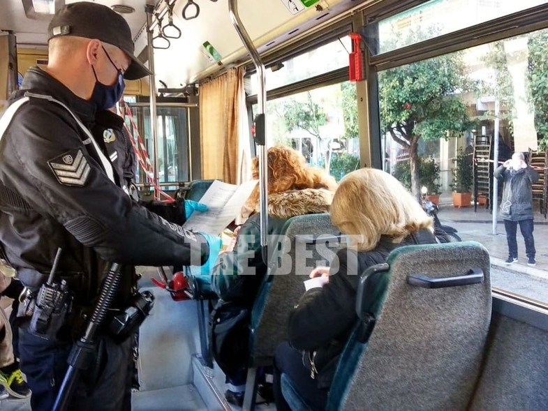 Έλεγχοι γίνονται και σε διερχόμενα λεωφορεία, καθώς οι επιβάτες καλούνται να παραδώσουν πιστοποιητικά και να επιδείξουν τα μηνύματα με τους λόγους μετακίνησής τους.