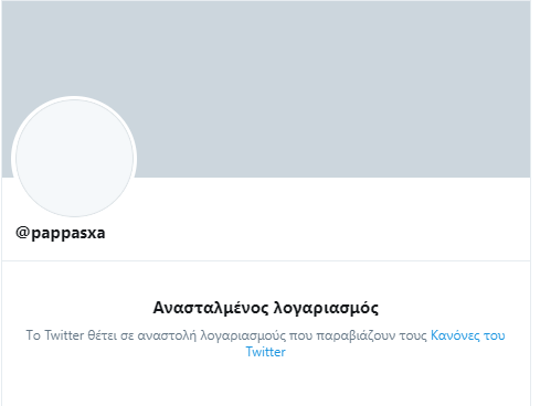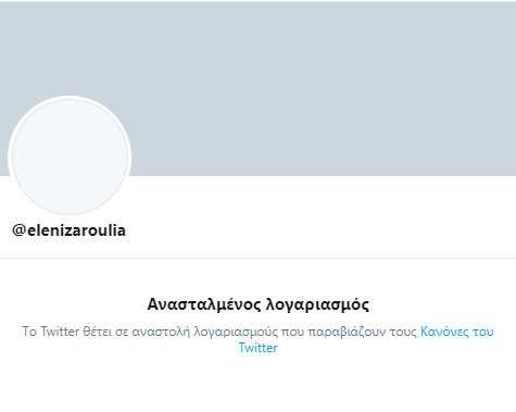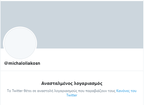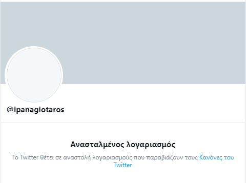 «Τo Τwitter θέτει σε αναστολή λογαριασμούς που παραβιάζουν τους κανόνες του Twitter» αναφέρεται αν επισκεφτεί κανείς τους εν λόγω λογαριασμούς.