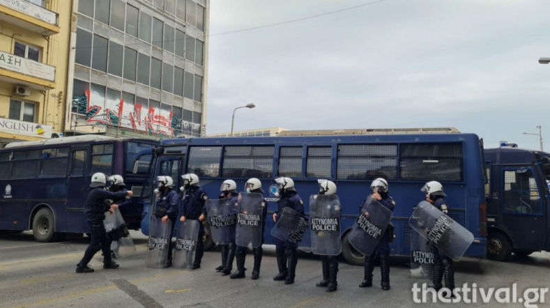Όταν η πορεία έφτασε στο σιντριβάνι συνάντησε φραγμό των ΜΑΤ. Αντιπροσωπεία των διαδηλωτών ζήτησε από τον επικεφαλής των μέτρων να περάσουν για να επιστρέψουν στο ΑΠΘ.