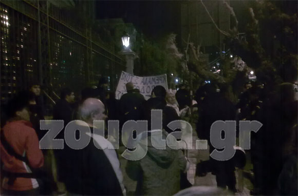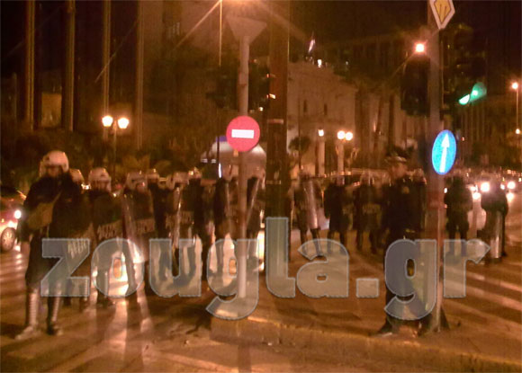 Σύμφωνα με τους διαδηλωτές που συγκεντρώθηκαν αρχικά στην πλατεία Συντάγματος, λίγο μετά τις 19:00, δύο διμοιρίες των ΜΑΤ τους απώθησαν με βία, ανακόπτοντας την πορεία τους, στο ύψος της πρεσβείας της Αιγύπτου, στη Βασιλίσσης Σοφίας.