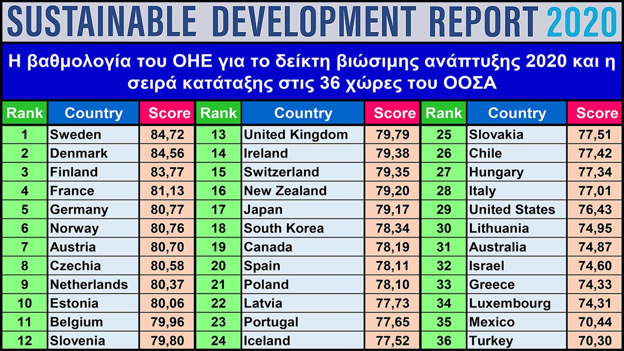 Στον παρακάτω πίνακα φαίνεται η συνολική βαθμολογία του ΟΗΕ για το δείκτη βιώσιμης ανάπτυξης 2020 στις 36 χώρες του ΟΟΣΑ και η σειρά κατάταξης των χωρών: