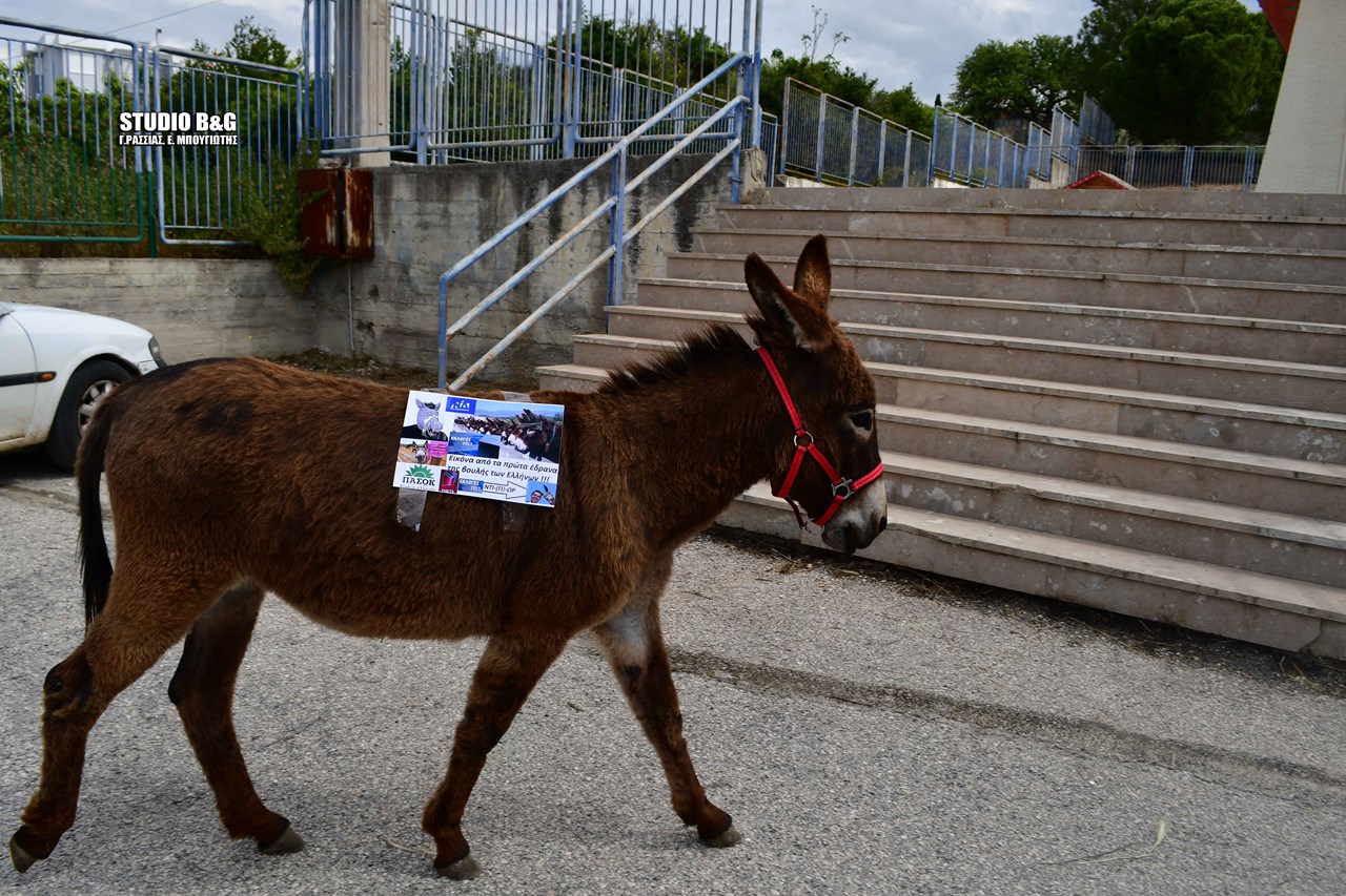Ένας αγρότης προσήλθε πάνω σε άλογο και με τη συνοδεία ενός μικρού γαϊδουριού στο εκλογικό τμήμα του Ειδικού Γυμνάσιου Αργολίδας στα Λευκάκια του Δήμου Ναυπλιέων, προκειμένου να ψηφίσει στις εκλογές της 21ης Μαΐου.